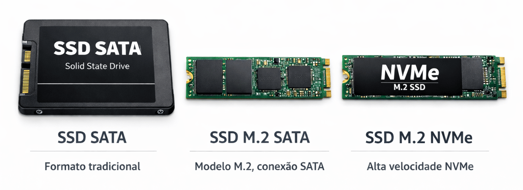 Principais tipos de SSD utilizados atualmente: SATA, M.2 SATA e M.2 NVMe.